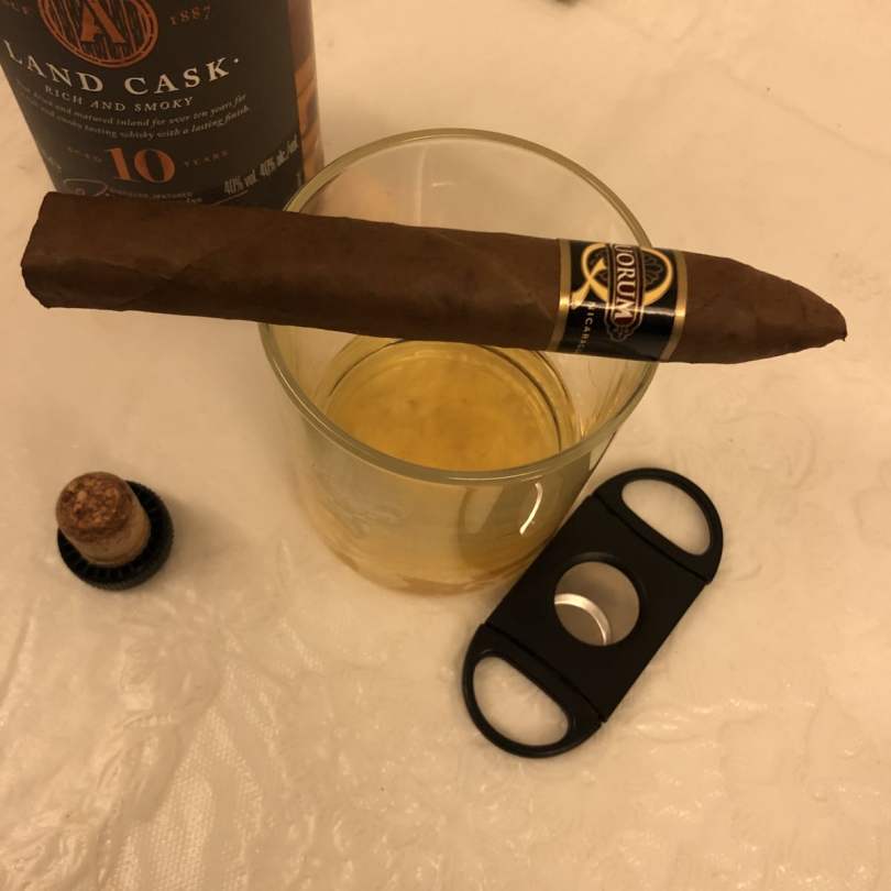 The Quorum Torpedo is earthy and leathery with minute hints of chocolate. Like most medium-to-full bodied cigars, you can pair it with peated whisky. And that’s exactly what I did.